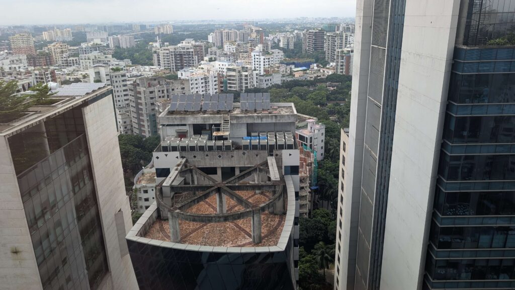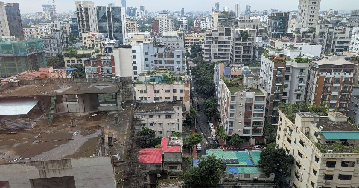 ホテルの窓からダッカ市内を見渡す。眼下に広がるのは、中層のコンクリートビルが隙間なく密集する雑然とした風景だ。