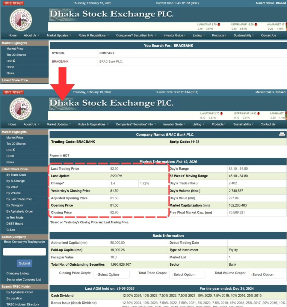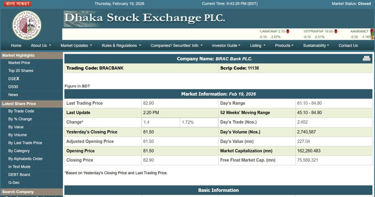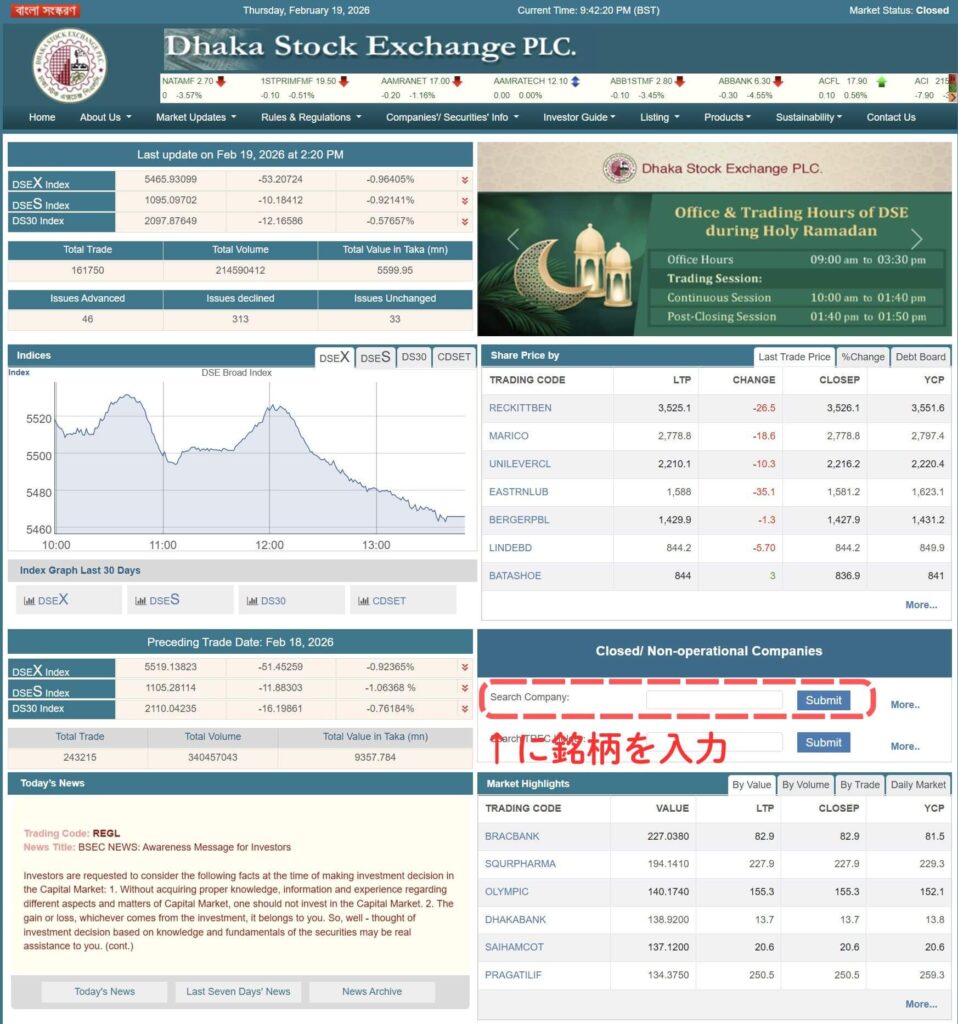 ダッカ証券取引所(Dhaka Stock Exchange)の公式サイトを確認する。